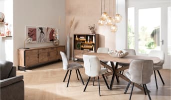 Dit dressoir uit collectie Pantin van Happy@Home meet 230cm breed en is 80cm hoog. Met 4 grote deuren en 2 ruime laden kom je zeker geen opbergruimte tekort. De meubelen uit deze collectie zijn uitgevoerd in de lichte, natuurlijke kleur Barnwood en zijn gemaakt uit het onderhoudsvriendelijke materiaal Primo Laminato. De fijne metalen accenten zorgen voor een stoere touch.